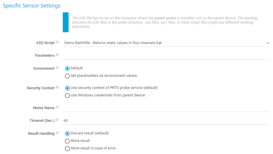 Set placeholders as environment values: Define if command-line parameters of PRTG are also available as environment parameters in your executable or script. For example, you can read and use the current host value of the parent device from within your script. This option can pose a security risk because credentials are exposed in several variables. It is not possible to use the environment variables in the parameters setting for batch scripts (.bat) for security reasons.