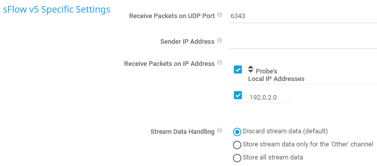 This sensor requires that the sFlow v5 export is enabled on the target system. The target system must send the flow data stream to the IP address of the probe system.